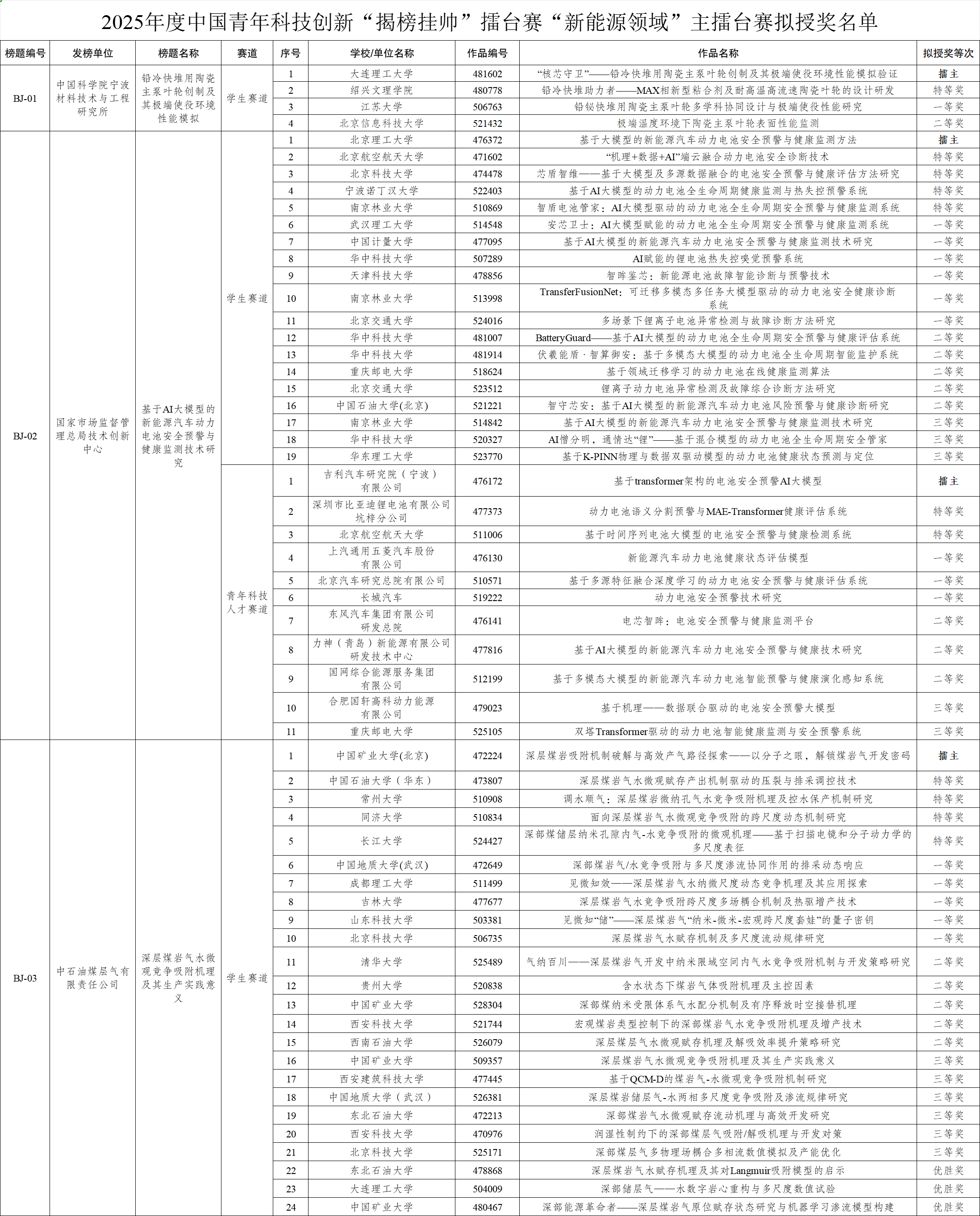 2025年度中国青年科技创新“揭榜挂帅”擂台赛“新能源领域”主擂台赛拟授奖名单公示