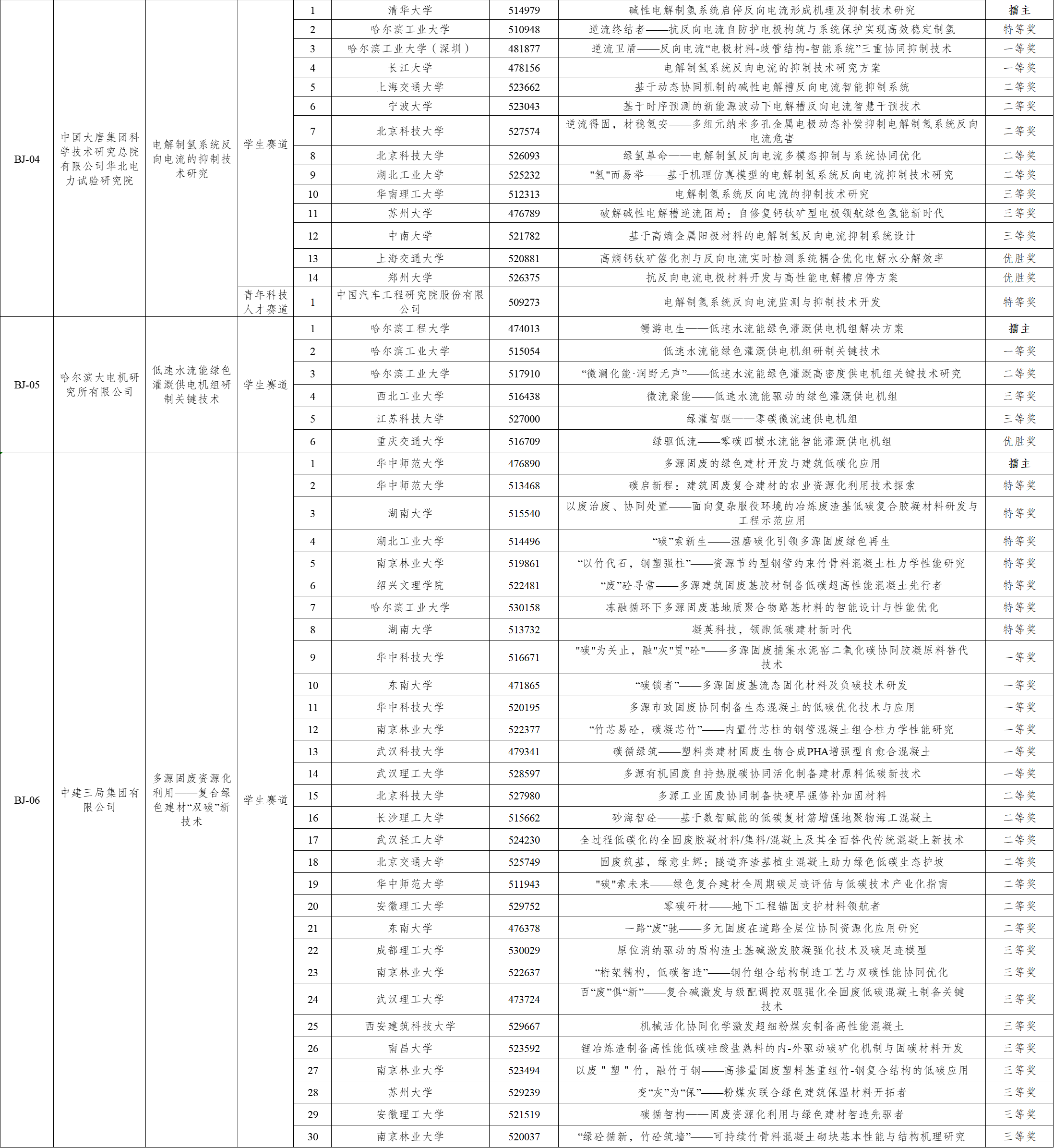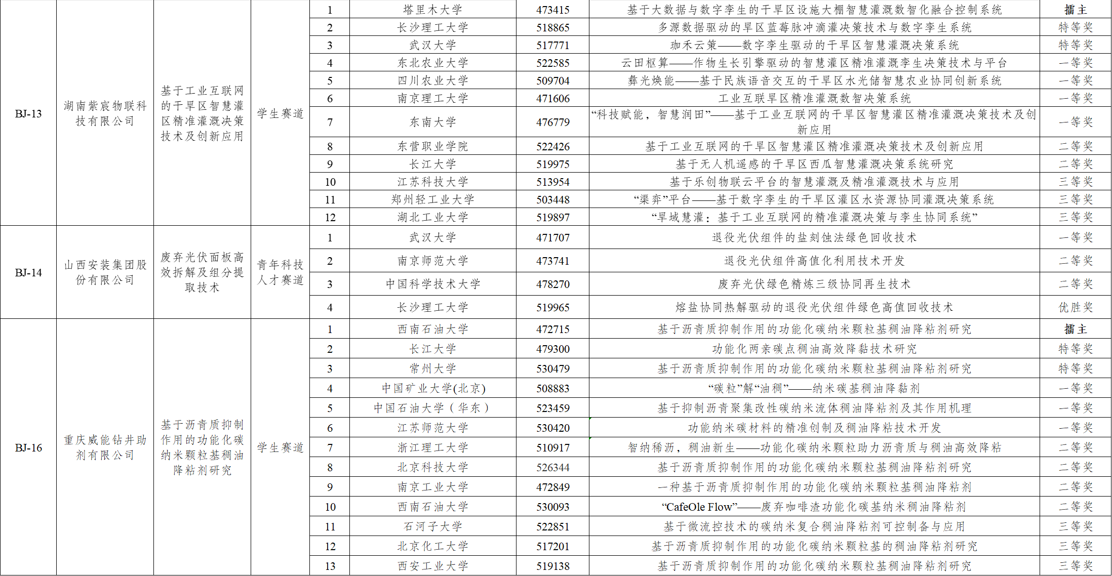 经资格审查、作品初审和终审擂台赛等环节,并在国家公证人员监督下,大赛组委会完成奖项评定工作,拟授学生赛道擂主13个、特等奖32个、一等奖47个、二等奖52个、三等奖60个、优胜奖19个;青年科技人才赛道擂主1个、特等奖4个、一等奖4个、二等奖5个、三等奖2个、优胜奖1个。现将名单予以公示(同一授奖等次排名不分先后)。