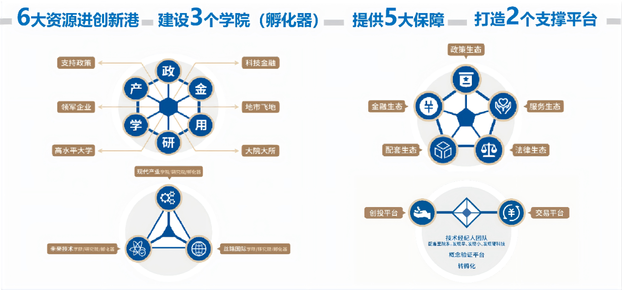 中国西部科技创新港创新实施“6352”工程、“1121”产学研融合新模式,初步建设了以国家重大科研平台等为主的创新策源圈层、以校企联合成果转化中心等为主的产教融合圈层、以科技产业孵化园等为主的产业培育圈层。目前已与241家龙头领军企业共建联合研究院(中心),建立了92个校企深度融合创新联合体,组建70余人的职业化科技经纪人团队,引入260余家金融机构。